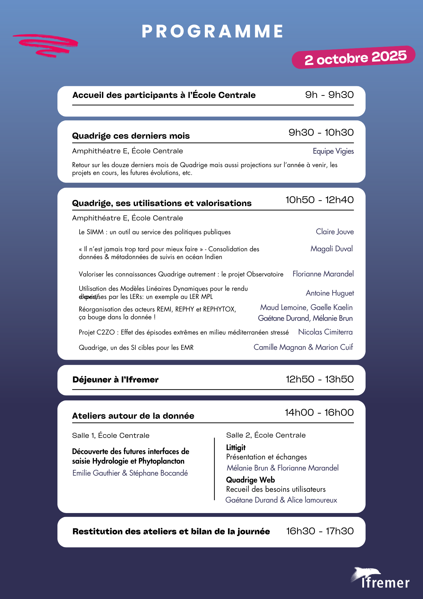 L'équipe VIGIES vous invite à la seconde édition des Journées Utilisateurs Quadrige qui se tiendra le 02 octobre 2025 au centre Atlantique de l'Ifremer ainsi qu'à l'Ecole Centrale de Nantes.